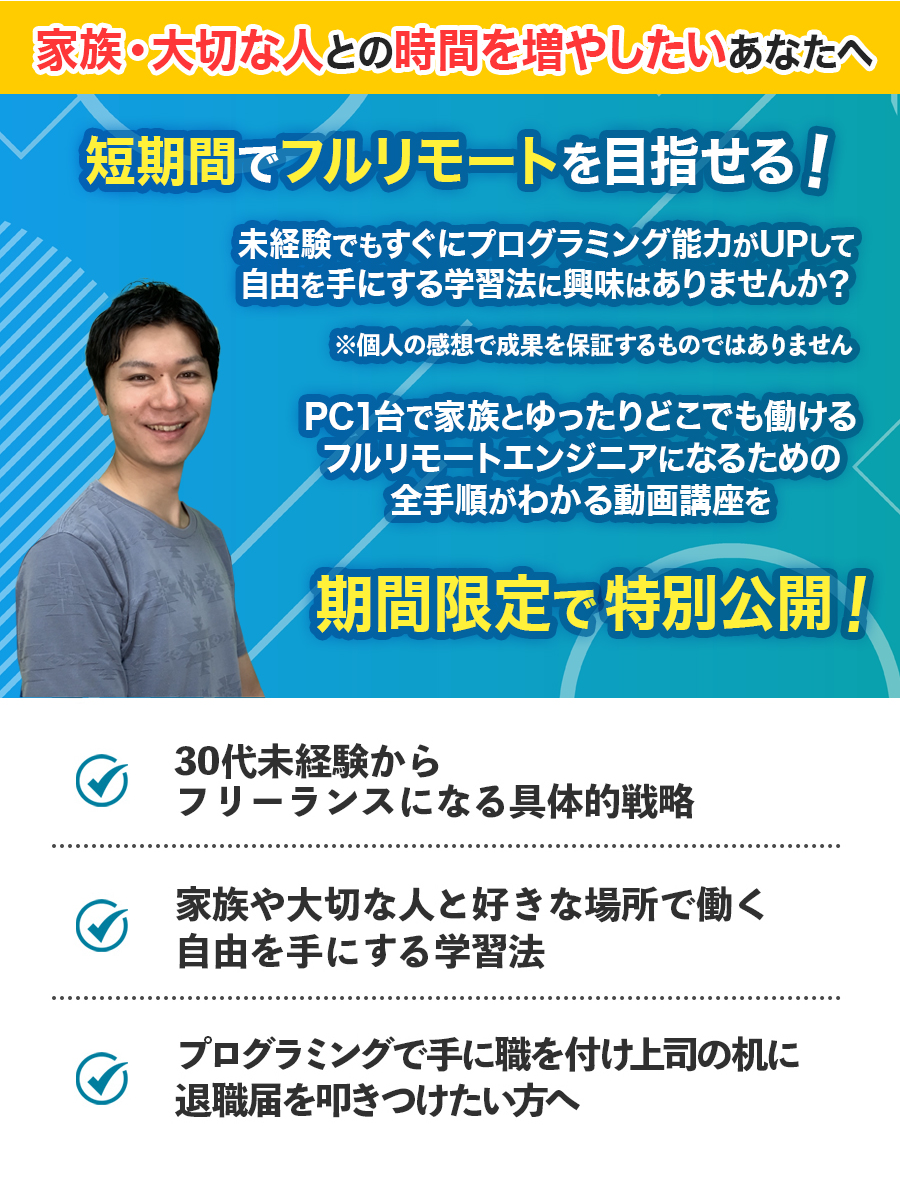 | Webセミナー | 無料 | エンジニアになるための 学習法/転職術/独立方法をオンラインセミナーで解説 |